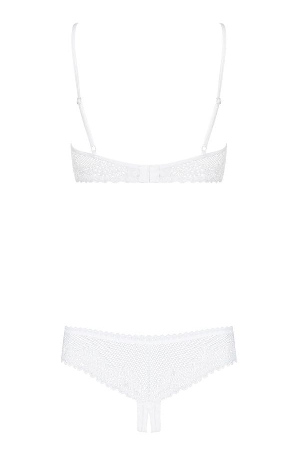 Komplet Alabastra to połączenie elegancji i pikanterii, które z pewnością rozgrzeje atmosferę. Półbiustonosz z fiszbinami pięknie modeluje piersi, a regulowane ramiączka i kilkustopniowe zapięcie pozwalają na perfekcyjne dopasowanie. Biała koronka o kwiatowym wzorze wprowadza romantyczny nastrój, który idealnie dopełniają otwarte stringi. Delikatna błyskotka między miseczkami oraz urocza kokardka dodają całości kobiecego wdzięku. Komplet stworzony został z przyjemnego w dotyku materiału o wyjątkowej elastyczności, który subtelnie otula ciało.
