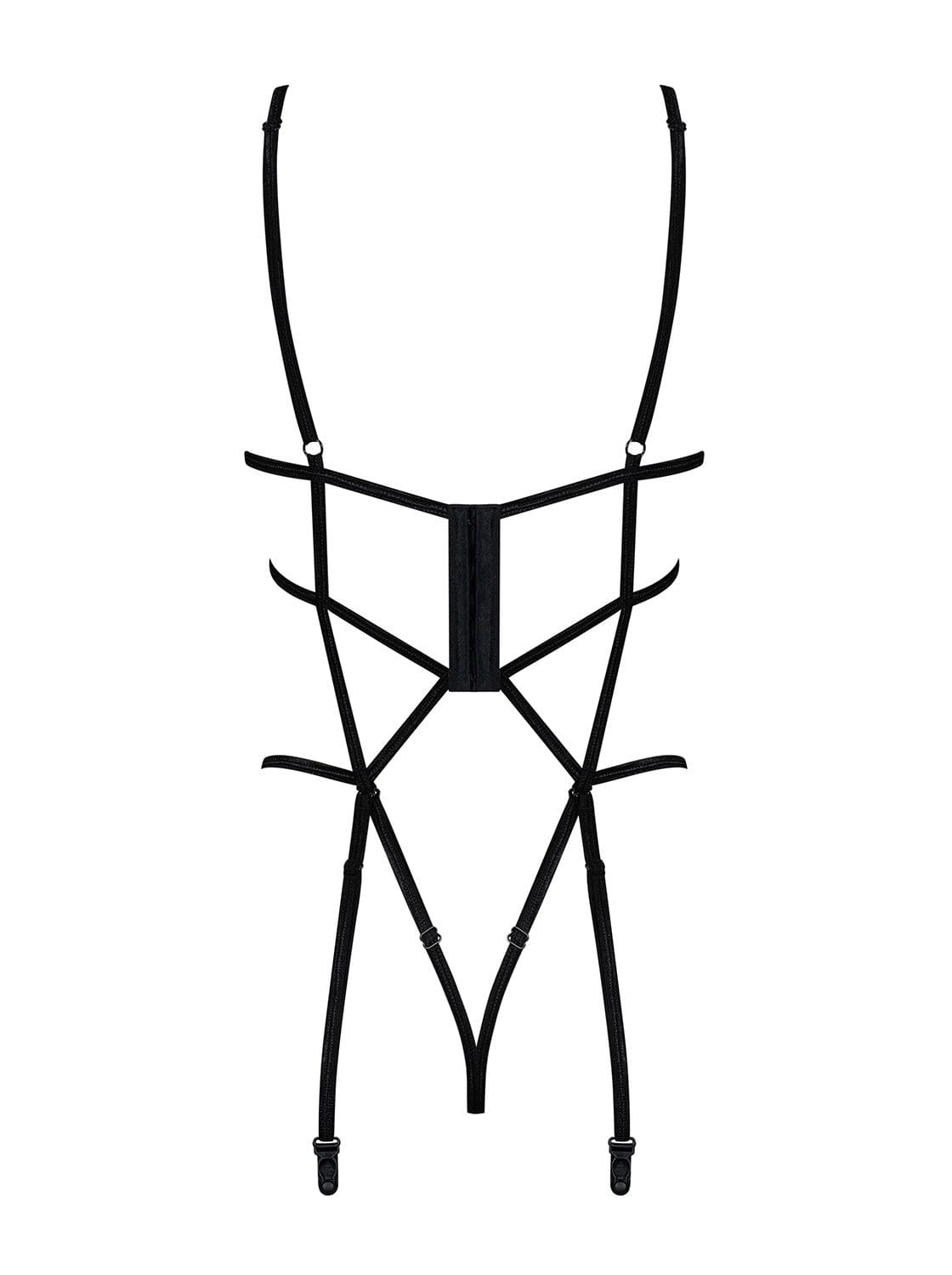 Czarne, otwarte body Badossa z elegancką gipiurą i regulowanymi paskami. Odkryj swoje fantazje dzięki seksownemu krojowi, odpinanym paskom do pończoch i elastycznemu materiałowi. Idealne na niezapomniane chwile we dwoje!