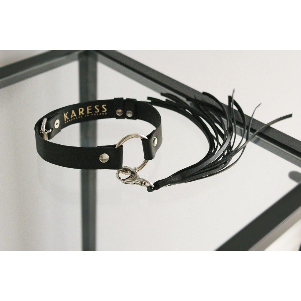 Czarna skórzana obróżka Estera Karess to elegancka uprząż z naturalnej skóry bydlęcej. Regulowane paski idealnie dopasowują się do sylwetki, podkreślając biust. Wysoka jakość, niklowane dodatki i złoty logotyp KARESS®.