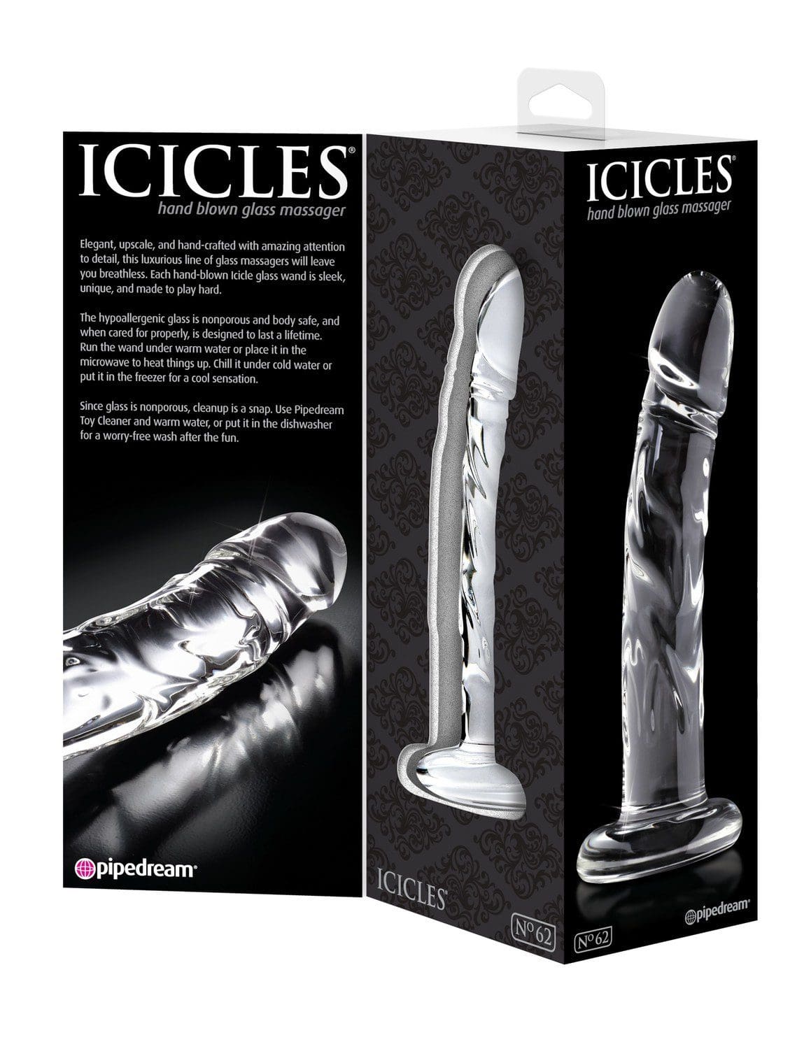 Icicles No. 62 to elegancki, szklany masażer o zakrzywionym profilu i realistycznej teksturze. Wykonany z hipoalergicznego szkła, zapewnia higienę i komfort. Idealny do stymulacji punktów G i P, kompatybilny z uprzężami strap-on.