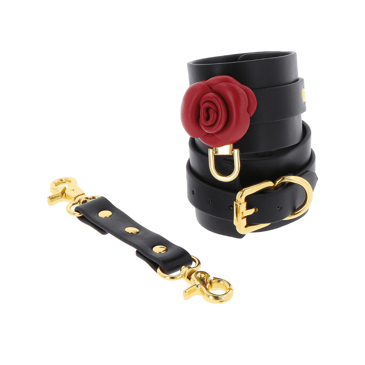 Kajdanki na nadgarstki TABOOM Wild Roses to eleganckie akcesoria BDSM z wysokiej jakości sztucznej skóry. Ozdobione skórzaną różą, oferują komfort i styl. Regulacja obwodu 18-24 cm zapewnia uniwersalność i wygodę.
