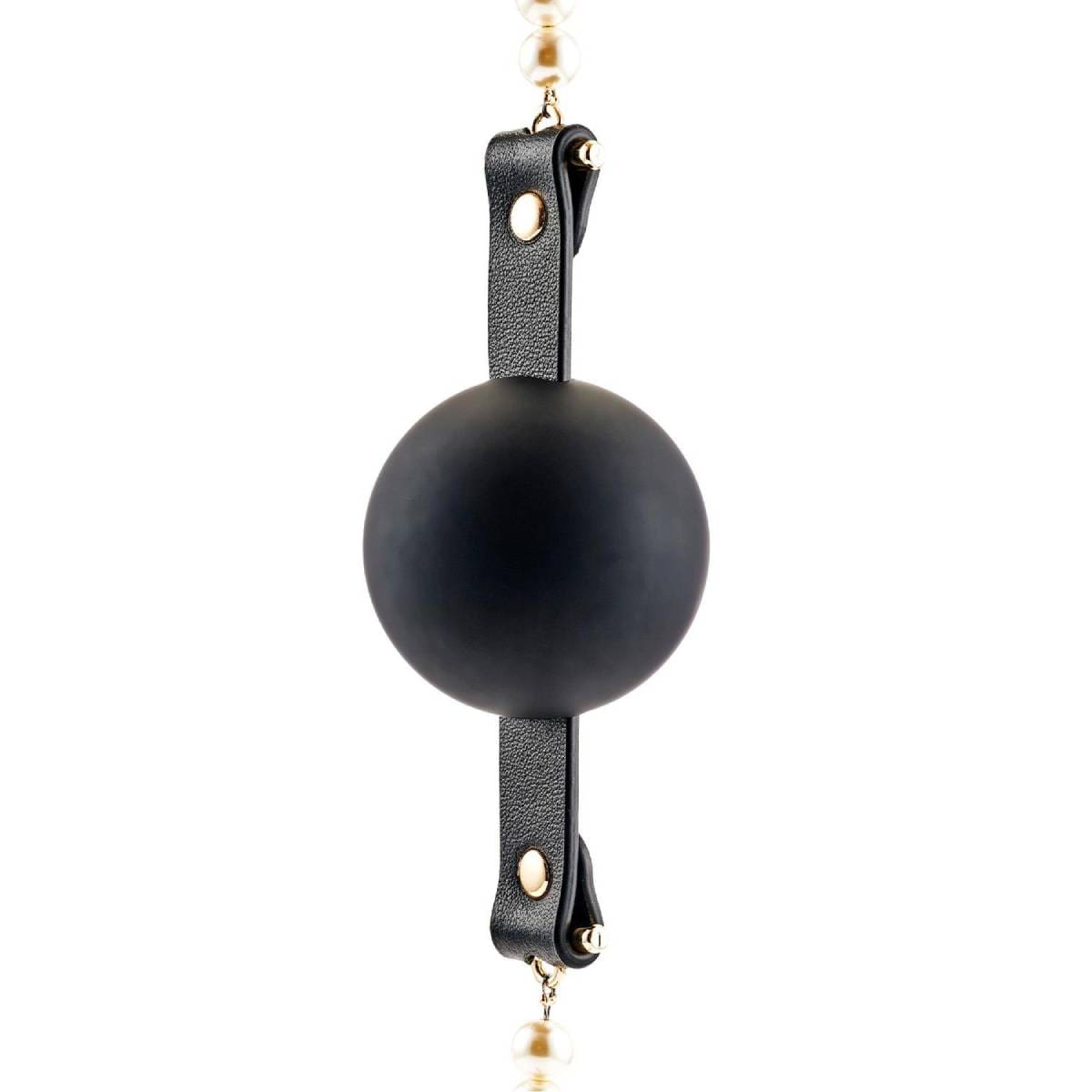 Centralnym elementem jest miękka kula z silikonu klasy medycznej, bezpieczna i delikatna dla ust, zapewniająca komfort nawet przy dłuższym użytkowaniu. Regulowany pasek z wegańskiej skóry umożliwia idealne dopasowanie, a złote okucia i ozdobny sznur pereł dodają całości wyrafinowanego charakteru. To gadżet, który zachwyca nie tylko funkcją, ale też wyglądem – przyciąga wzrok i podkreśla atmosferę eleganckiej dominacji.