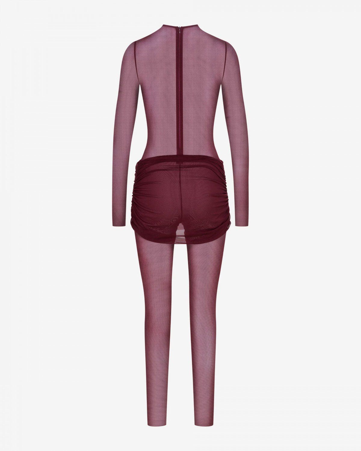 Ambra Burgundy to elegancki kombinezon z transparentnej siateczki, zaprojektowany z myślą o kobietach, które cenią nowoczesny styl i komfort. Miękki, elastyczny materiał dopasowuje się do sylwetki, a subtelne marszczenia na biuście i biodrach podkreślają jej naturalne kształty.