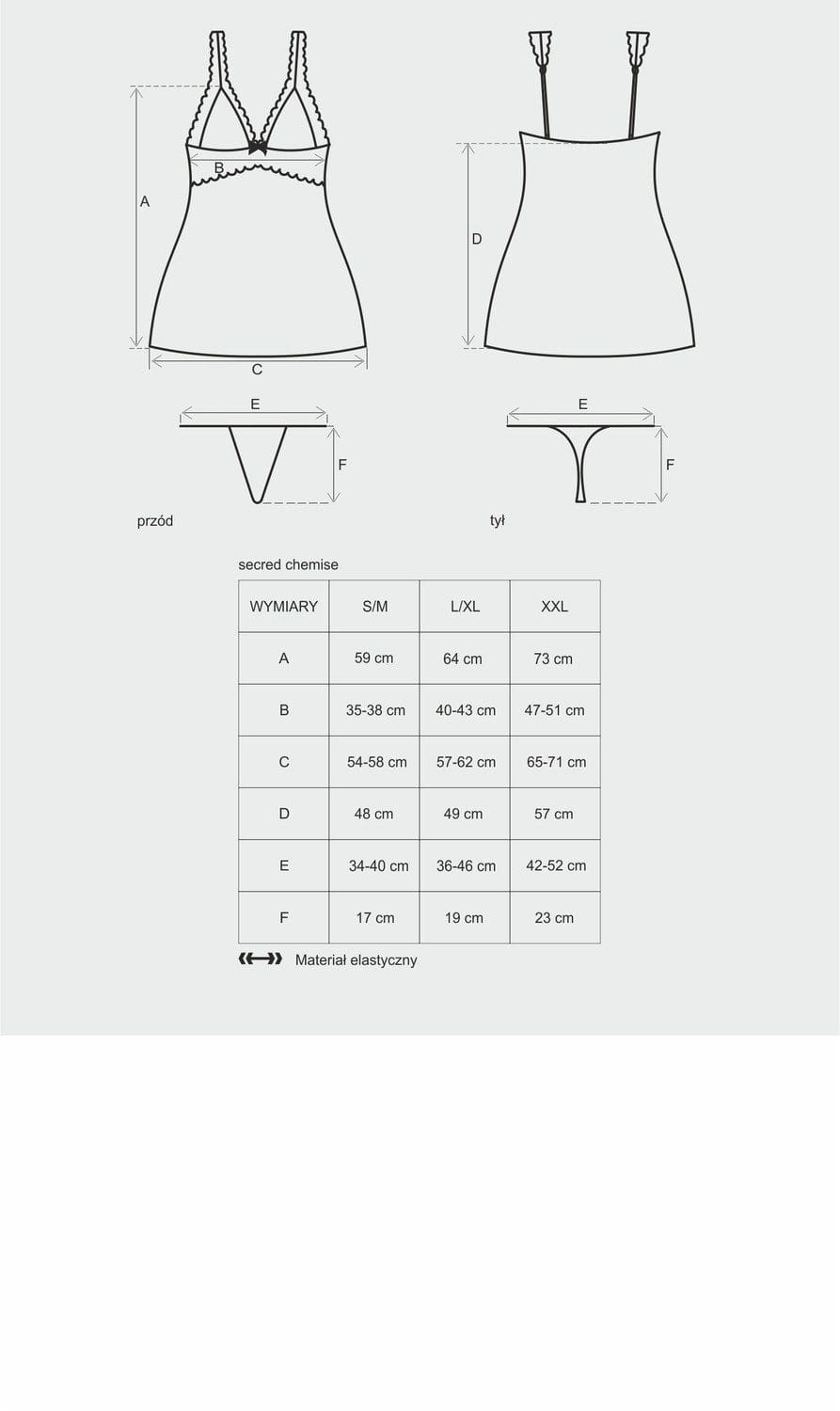 Obsessive Secred koszulka – zmysłowa koszulka w ognistym kolorze. Uszyta w całości z połyskującego materiału w towarzystwie czerwonej koronki eksponuje kobiece wdzięki. Głęboki dekolt na szerokich ramiączkach w kształcie litery V wygląda świetnie na obfitych piersiach. Brzegi są wykończone elegancką koronką, która powielona także na bokach optycznie wysmukla sylwetkę. Do kompletu Obsessive Secred dołączone są stringi wykonane z takiego samego materiału. Regulowane ramiączka pozwalają na idealne dopasowanie ich długości. W składzie materiał znajdziemy 100% poliester.
