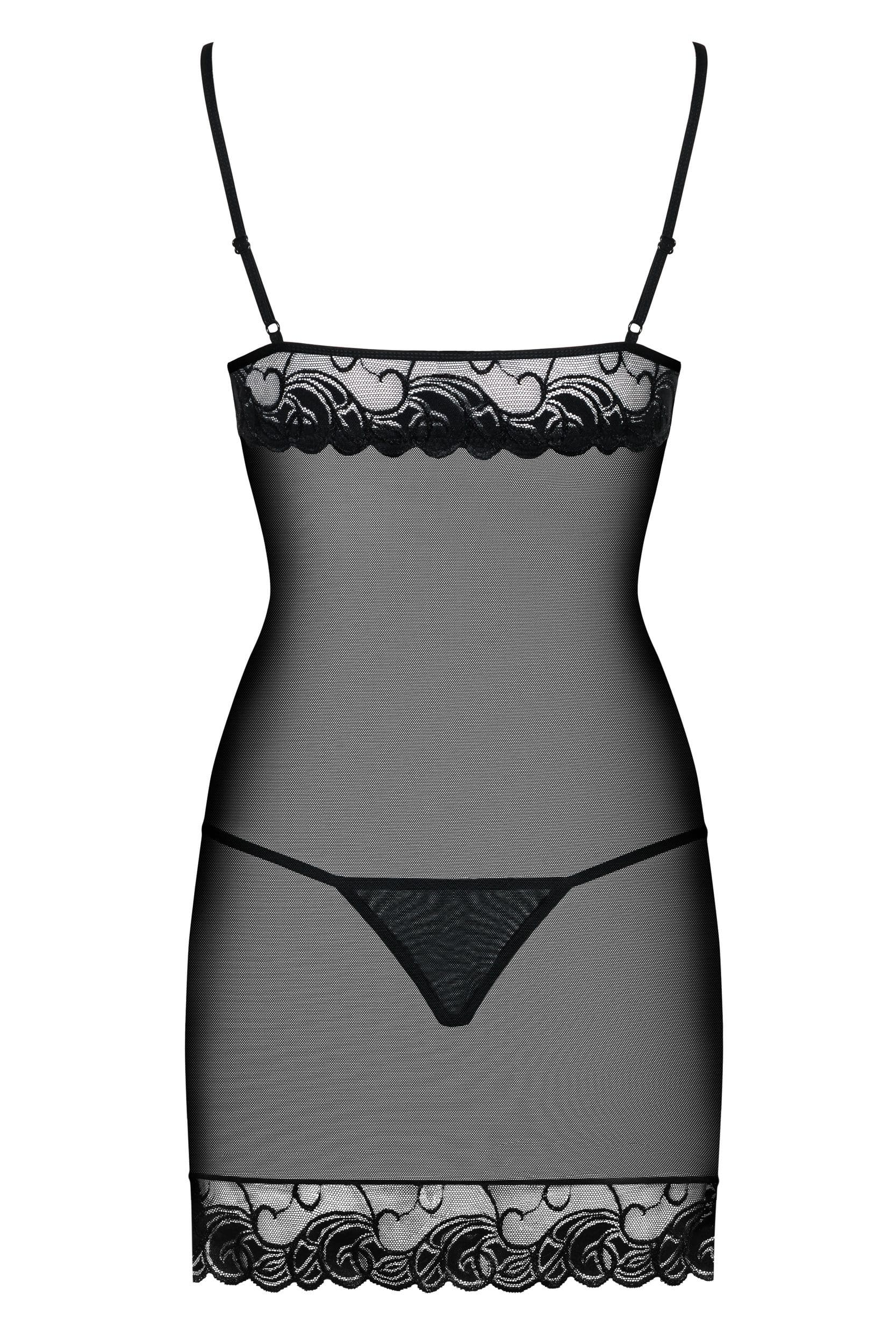 Obsessive Wonderia to delikatna koszulka nocna, która łączy zmysłowość i elegancki styl w wyjątkowo uwodzicielskiej formie. Uszyta z czarnej, transparentnej siateczki i zdobiona kwiatową koronką, pięknie układa się na sylwetce, subtelnie ją eksponując.