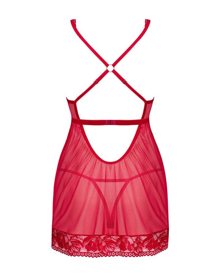 Zmysłowy zestaw Lacelove w intensywnej czerwieni. Przezroczysta babydoll z koronkowymi wstawkami, fiszbinami i regulowanymi ramiączkami. W komplecie dopasowane stringi, które podkreślają kształty. Idealne na romantyczne wieczory.