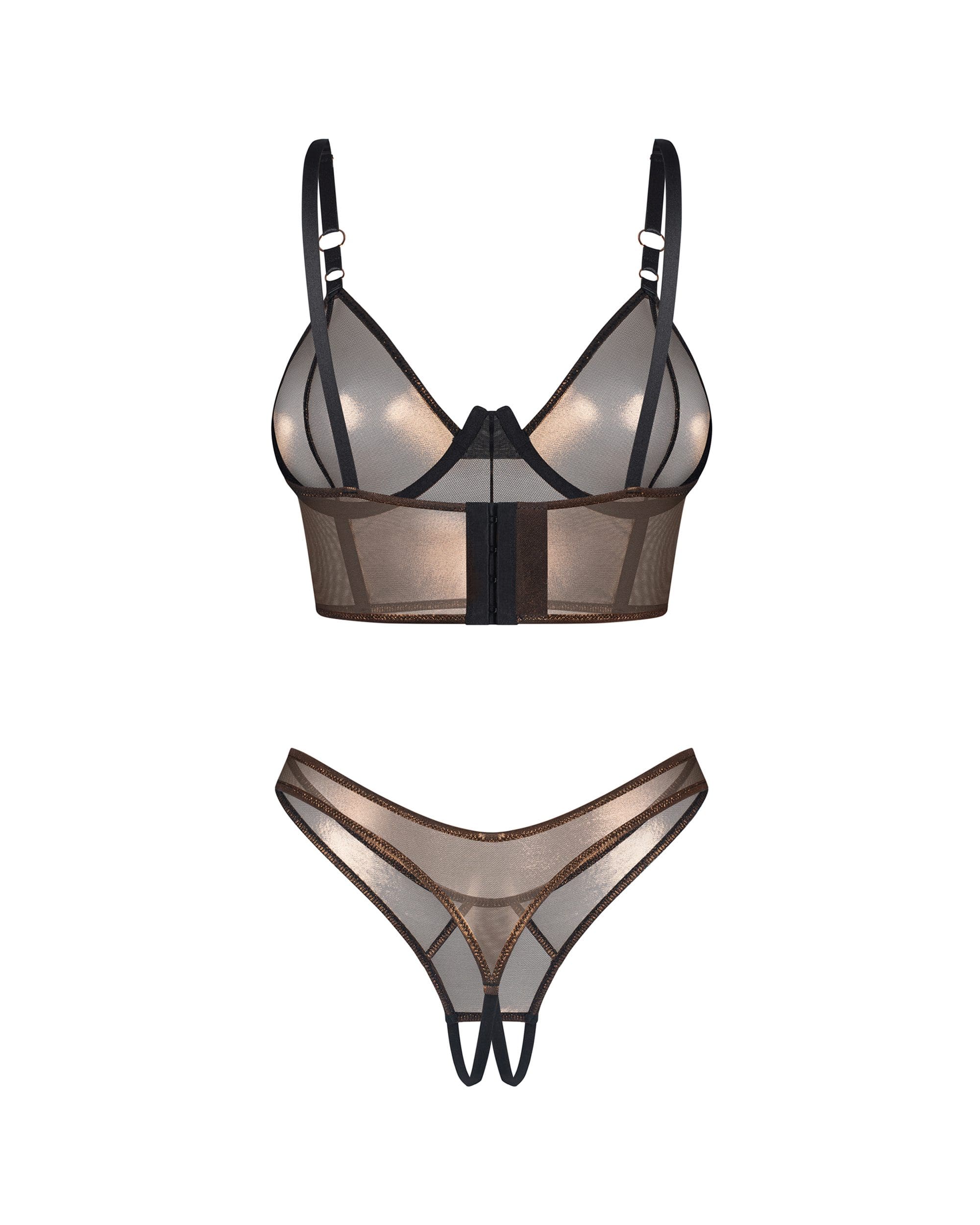 Otwarte stringi o odważnym kroju stanowią zmysłowe dopełnienie całości, zachęcając do flirtu i zabawy. Regulowane ramiączka oraz zapięcie na plecach pozwalają perfekcyjnie dopasować komplet do sylwetki. Wykonany z przyjemnego w dotyku, elastycznego materiału (95% poliester, 5% elastan), zaprojektowany w UE – dla kobiet, które uwielbiają błyszczeć i kusić subtelnym blaskiem.