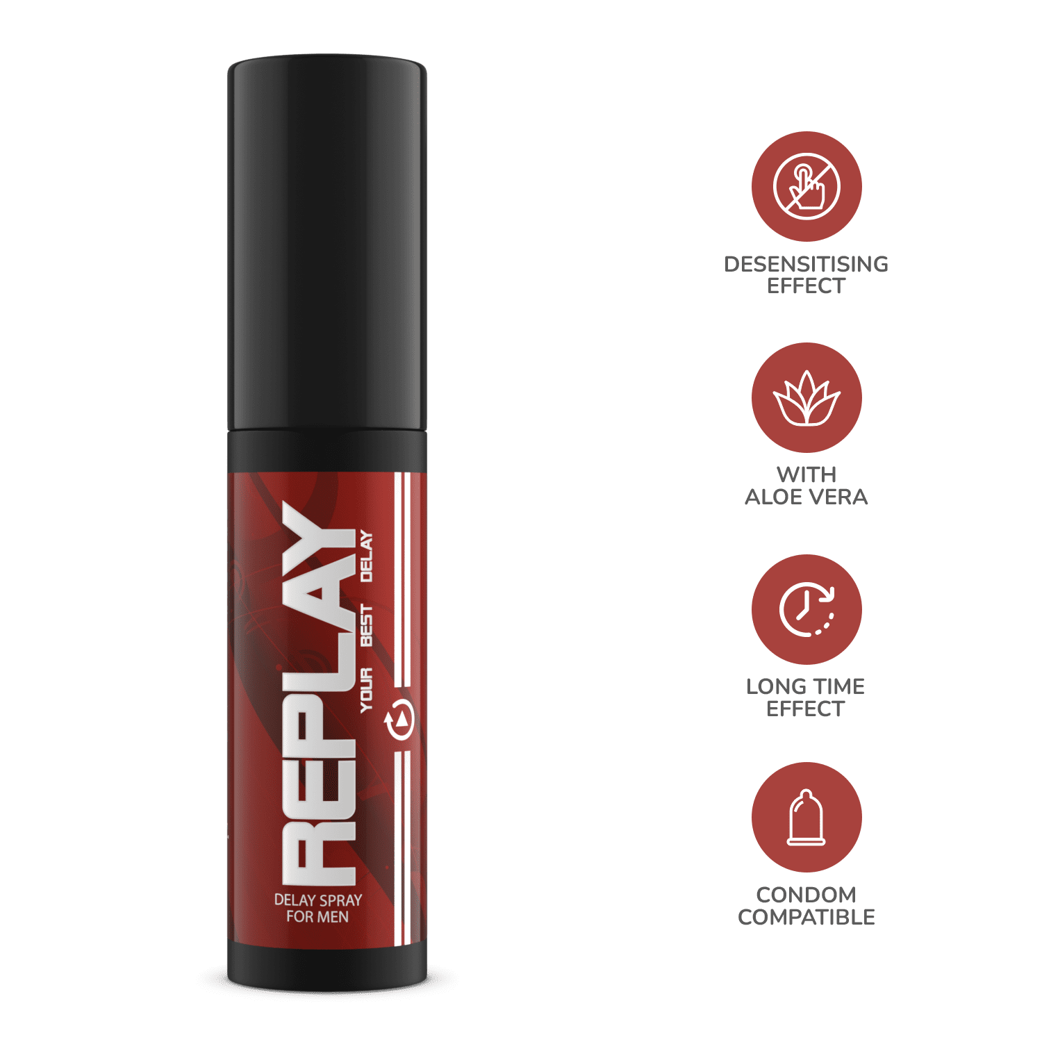 Replay to spray opóźniający dla mężczyzn, który wydłuża zbliżenia i redukuje nadwrażliwość. Nawilżająca formuła z aloesem zapewnia komfort i bezpieczeństwo. Kompatybilny z prezerwatywami, idealny do seksu waginalnego i analnego.
