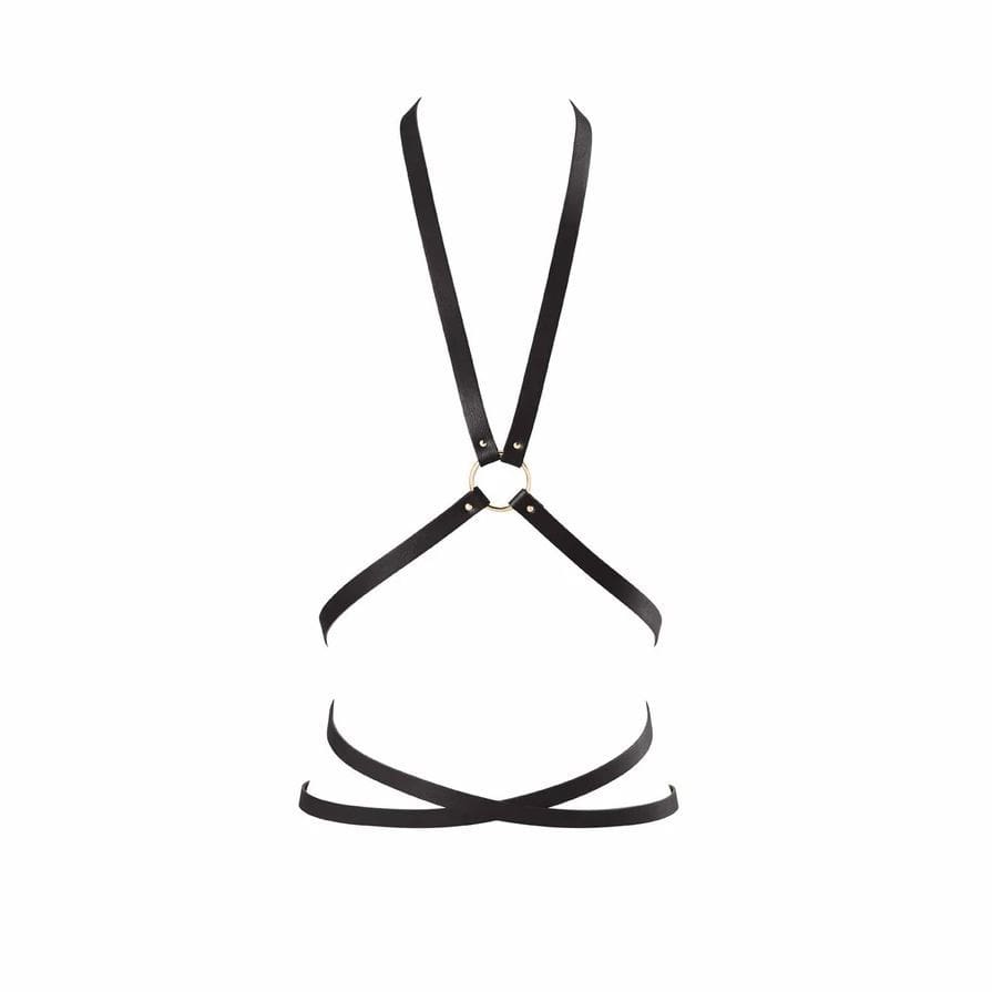 Uprząż skomponowana ze skóropodobnych pasków marki Bijoux Indiscrets. Paski krzyżowo oplatają talię oraz klatkę piersiową, bardzo zmysłowo eksponując biust. Artykuł pochodzi z kolekcji MAZE na sezon jesień / zima 2017.