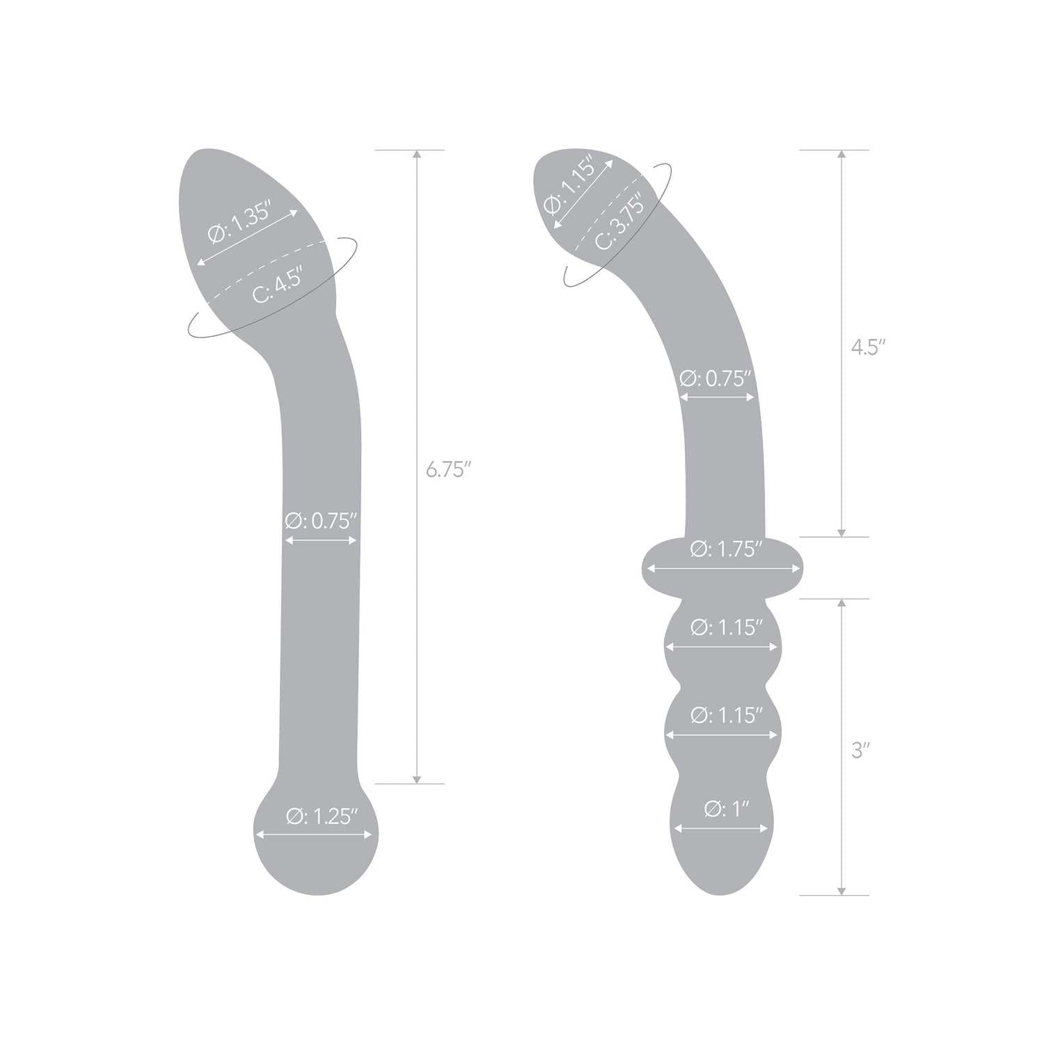 Zestaw dwóch szklanych dild do stymulacji punktu G. Gładkie, zakrzywione kształty, jeden z końców żebrowany. Wykonane z hipoalergicznego szkła borokrzemowego, łatwe w czyszczeniu. Idealne do eksperymentów z temperaturą.